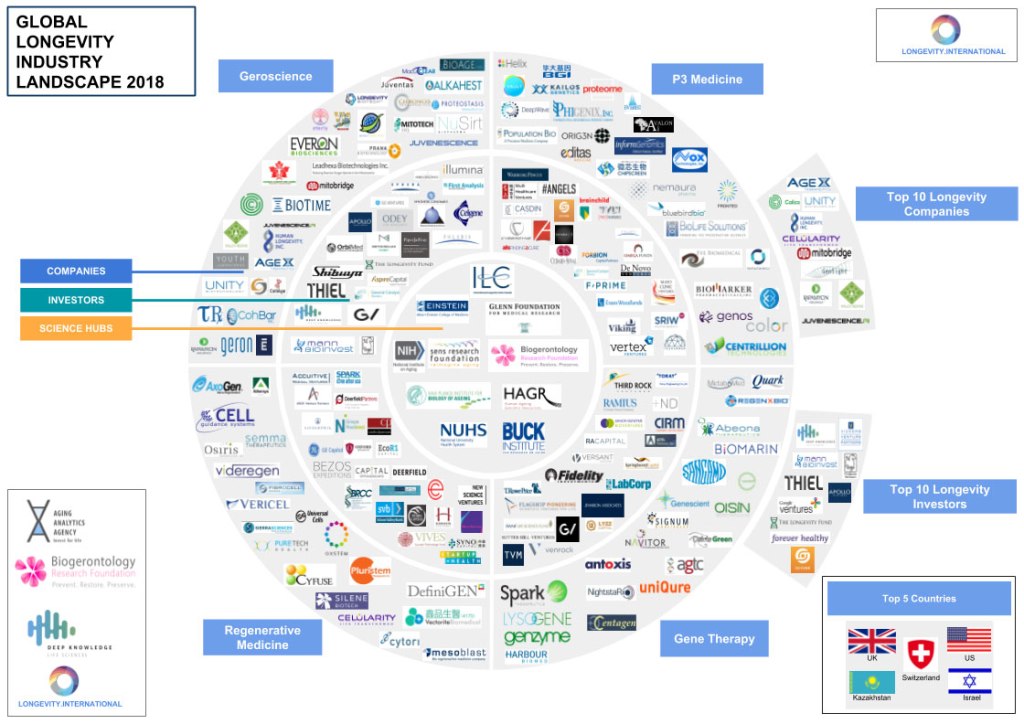 More and more people are considering the possibility of actually seeing a cure for aging in our lifetime. Is it possible that “aging” as we know it actually is a disease, and that there could be a cure for this? There are certainly many groups out there who think so, more than most people realize. As mentioned earlier, the amount of work and money that is going into aging research is quite astonishing. Some in the scientific community are pushing forward in this “too bizarre to be true” idea, and are expecting a cure for aging to be discovered within the next few decades. Groups such as the 250-staff-member Buck Institute for Research on Aging, Calico (backed and financed by Alphabet, the parent company of Google), the SENS Research Foundation, the Academy for Health and Lifespan Research which identifies as “sixteen of the world’s brightest and most distinguished gerontologists,” and I could go on. I have included here a Global Longevity Landscape chart from 2018 to give you a better idea of the amount of research going into this question of aging.