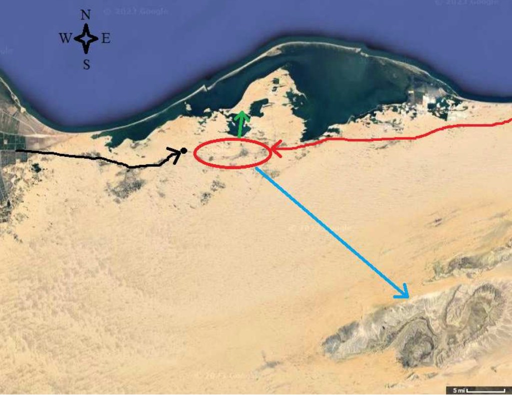 The biblical account tells us that as the congregation faced the water, a mighty east wind blew across the hot desert through the night, pushing the waters of the miles wide Ar Ruwaj lagoon over to the west, creating a dried up path, at least a mile wide, through the lagoon basin. While the waters were heaped up to the west, the congregation all safely went through on dry ground. (See the green arrow on the map above.)